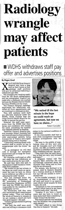 Around 2000 the old hospital on the hill moved down onto a flat site in Oamaru which had been purpose built around the shell of an old school. We were still employed by Otago DHB at the time, but the rest of the hospital had transitioned to Waitaki District Health Services, the community trust running the hospital. In 2007 Waitaki District Health Service took over radiology, but they would not employ us under the same terms and conditions of the MECA which we had with Otago. So, the department was closed, our job offers were withdrawn and the positions were advertised. That’s when APEX really stepped in for us and was invaluable in negotiating on our behalf in what was a stressful time for us all. Eventually we were reemployed on a new contract with the same MECA terms and conditions. No one turned up to take our jobs and that really proves the strength of APEX, we couldn’t have done it on our own.